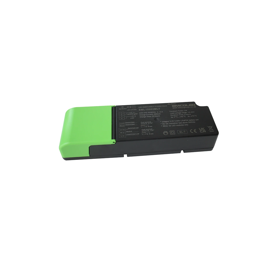 A compact 3-hour self-testing emergency pack providing 2W of constant power in emergency mode. Operating on 220–240V Class 2 input, it features automatic testing with an LED indicator and lamp included for easy monitoring.
