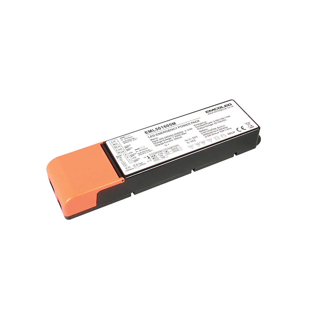 A reliable 50–160V DC emergency pack designed to deliver 5W constant power for 3 hours, with adjustable settings for 2.5W over 6 hours or 10W over 1.5 hours. Operating on 220–240V Class 2 input, it includes an LED indicator lamp and holder for easy status monitoring.