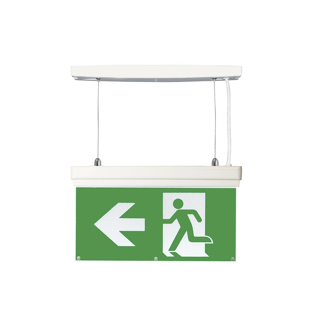 A sleek 3-hour maintained LED emergency exit sign with flexible 3-in-1 installation options — suspended, side wall, or rear wall mounted. Finished in white with a double-sided legend for clear visibility, it operates on 220–240V Class 2 input.